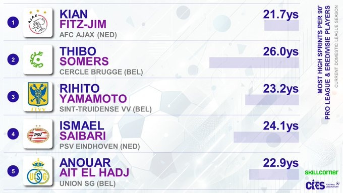 3月11日訊 數(shù)據(jù)分析機(jī)構(gòu)SkillCorner統(tǒng)計(jì)比甲和荷甲高速?zèng)_刺能力排行榜,阿賈克斯華裔中場天樂上榜。