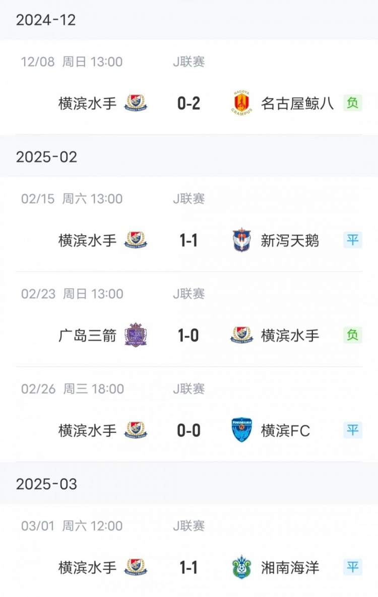 數(shù)據(jù)顯示,本賽季J聯(lián)賽戰(zhàn)罷5輪,橫濱水手還未嘗勝績(jī),4輪聯(lián)賽(橫濱少賽一場(chǎng))僅3平1負(fù)打進(jìn)2球,目前積3分排在J聯(lián)賽積分榜第18位。而算上上賽季的話(huà),橫濱水手在J聯(lián)賽已經(jīng)連續(xù)5場(chǎng)不勝(3平2負(fù)打進(jìn)2球丟掉5球)。