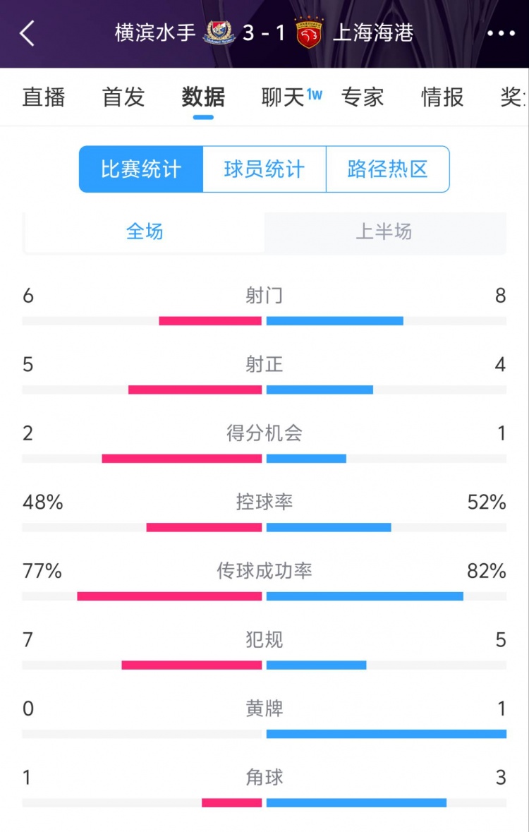 3月11日訊 半場(chǎng)結(jié)束,海港暫1-3落后&總比分1-4橫濱水手。半場(chǎng)數(shù)據(jù)方面,射門數(shù)海港8-6領(lǐng)先,射正4-5落后,控球率52%、傳球成功率82%均高于橫濱。 本文標(biāo)簽: 足球 中超 中國(guó)足球 上海海港