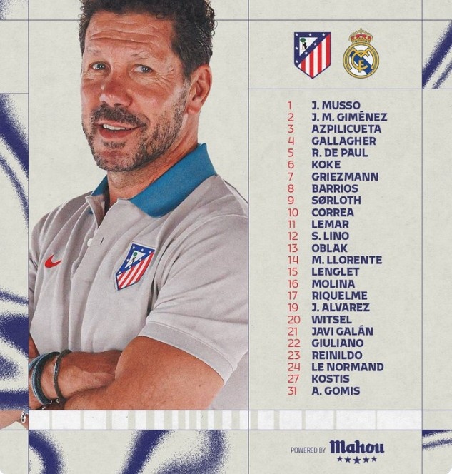 中場(chǎng):4-加拉格爾、5-德保羅、6-科克、7-格列茲曼、8-巴里奧斯、11-勒馬爾、12-利諾、14-馬科斯-略倫特、20-維特塞爾、