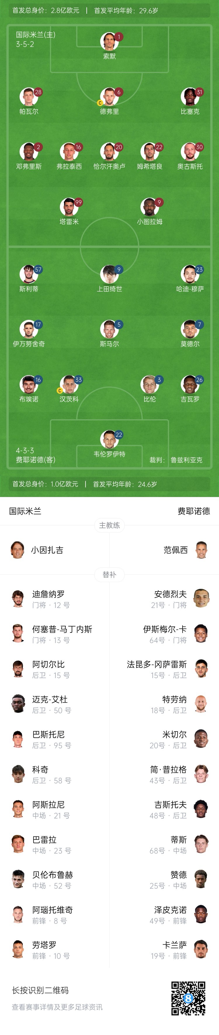 3月12日訊 歐冠16強次回合,國米主場迎戰(zhàn)費耶諾德比賽即將打響。賽前首發(fā)出爐。
