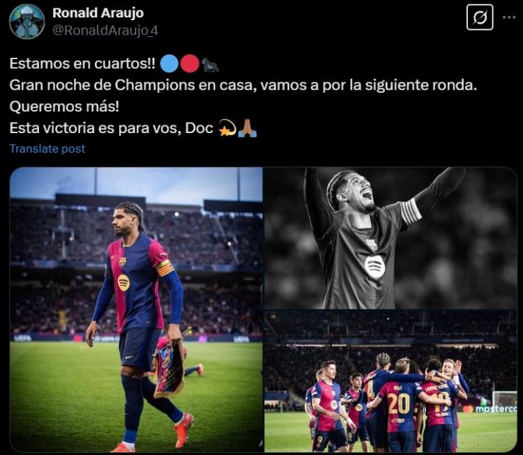 3月12日訊 在本輪歐冠,巴薩3-1擊敗本菲卡晉級。巴薩隊長阿勞霍也在賽后社媒曬照,將勝利獻(xiàn)給球隊已故隊醫(yī),配文寫道:“我們晉級8強,很棒的歐冠主場之夜,讓我們晉級下一輪!我們還想要更多。勝利獻(xiàn)給你,醫(yī)生。” 本文標(biāo)簽: 足球 西甲 巴塞羅那