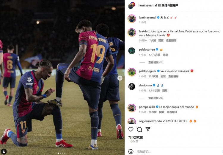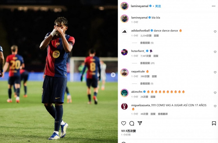 亞馬爾還通過(guò)社媒曬出自己的慶祝照,并配文:“bla bla”,似乎是在回?fù)艚趯?duì)他的質(zhì)疑。