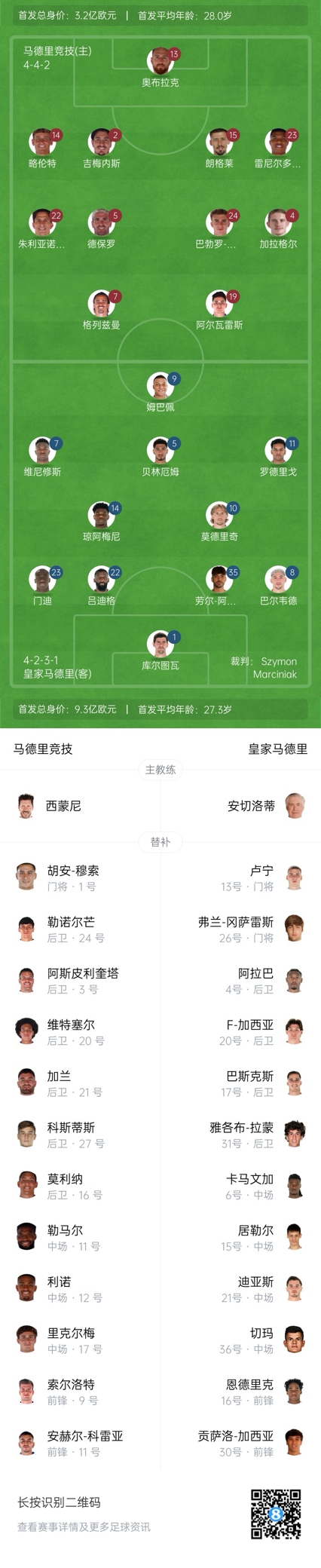馬競首發(fā):13-奧布拉克、14-略倫特、2-吉梅內(nèi)斯、15-朗格萊、23-雷尼爾多、22-西蒙尼、5-德保羅、8-巴里奧斯、4-加拉格爾、7-格列茲曼、19-阿爾瓦雷斯