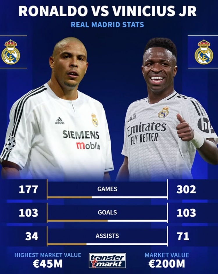 羅納爾多為皇馬出戰(zhàn)177場(chǎng),貢獻(xiàn)103球34助攻,巔峰德轉(zhuǎn)身價(jià)4500萬(wàn)歐。維尼修斯則在302場(chǎng)為皇馬貢獻(xiàn)103球71助攻,巔峰德轉(zhuǎn)身價(jià)2億歐。