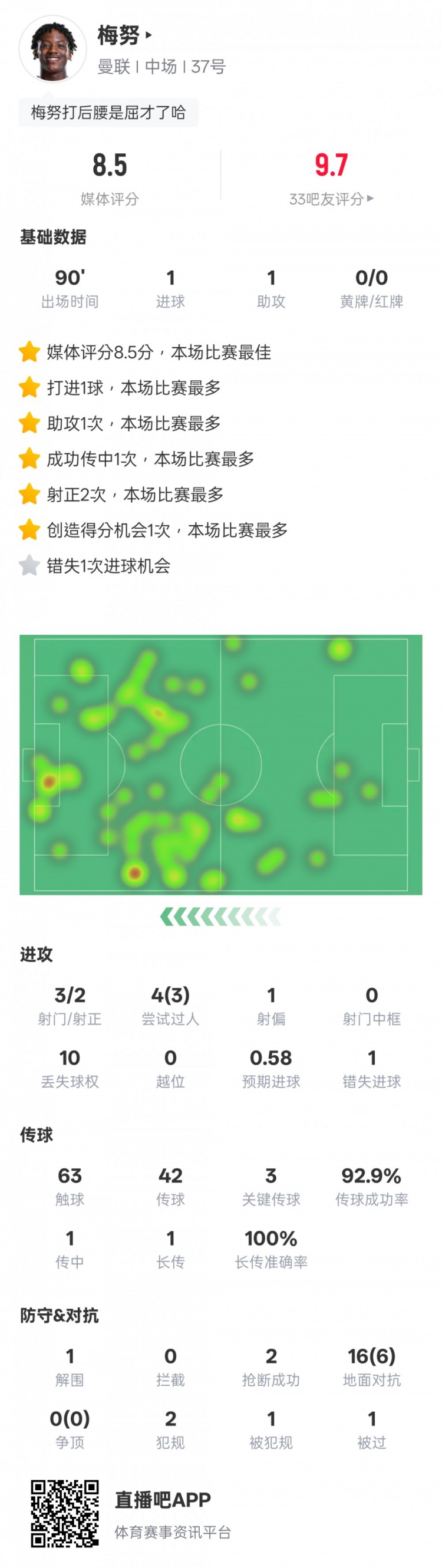 1月31日訊 歐聯(lián)杯聯(lián)賽階段第8輪,曼聯(lián)2-0戰(zhàn)勝布加勒斯特星,直通16強。本場比賽梅努首發(fā)出戰(zhàn),傳射建功,還有3次關(guān)鍵傳球,3次過人成功,評分8.5全場最高。