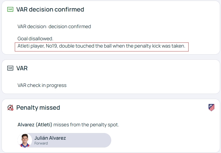 官方明確!歐冠官網(wǎng):阿爾瓦雷斯罰點時2次觸球,VAR決定進球無效