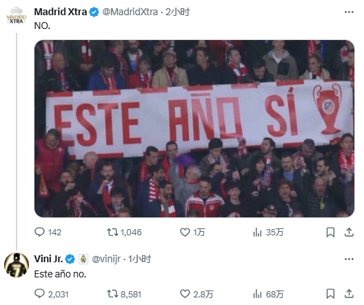 03月13日訊 歐冠1/8決賽皇馬點球大戰(zhàn)擊敗馬競,成功晉級8強。本場比賽馬競球迷在看臺舉起橫幅:歐冠就今年了!皇馬的球迷號曬出橫幅并表示NO,維尼修斯社媒回復(fù)該球迷號:今年,NO! 本文標(biāo)簽: 足球 西甲 皇家馬德里 馬德里競技 歐冠