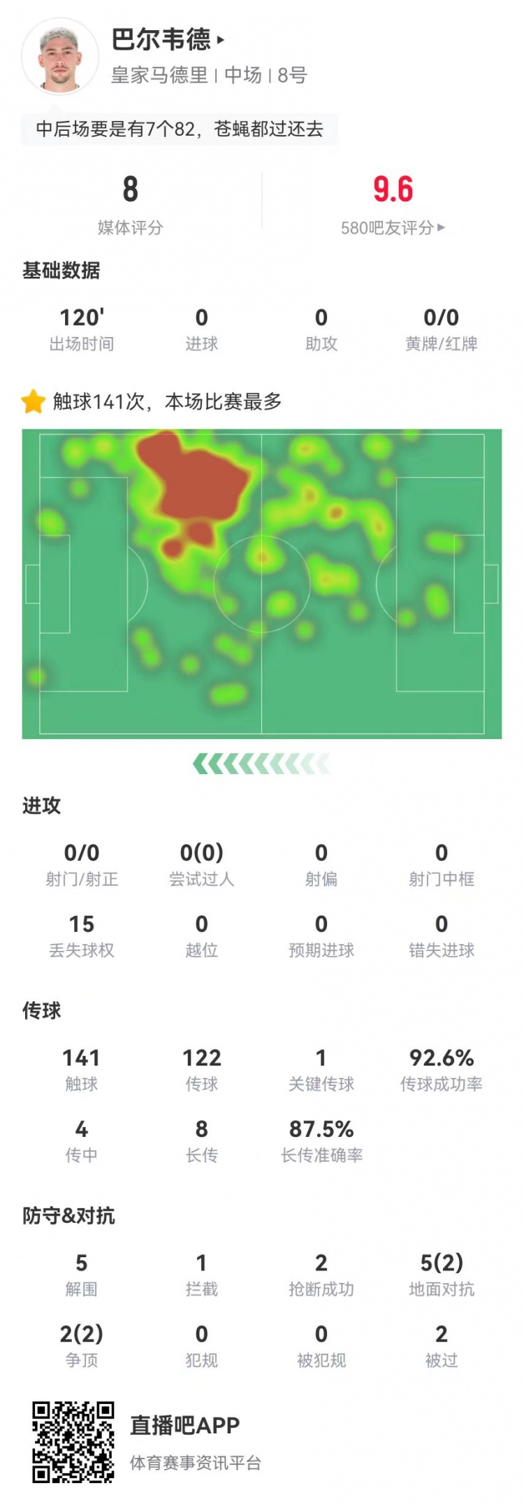 3月13日訊 皇馬在本輪歐冠點球淘汰馬競,巴爾韋德本場數(shù)據(jù)如下:首發(fā)踢滿全場5解圍1封堵1攔截2搶斷2被過7對抗、4成功15丟失球權(quán)141觸球122傳球、113成功,成功率93%1關(guān)鍵傳球4傳中、0成功8長傳、7成功1點球大戰(zhàn)進球獲評8.0分 本文標簽: 足球 西甲 皇家馬德里 馬德里競技 歐冠
