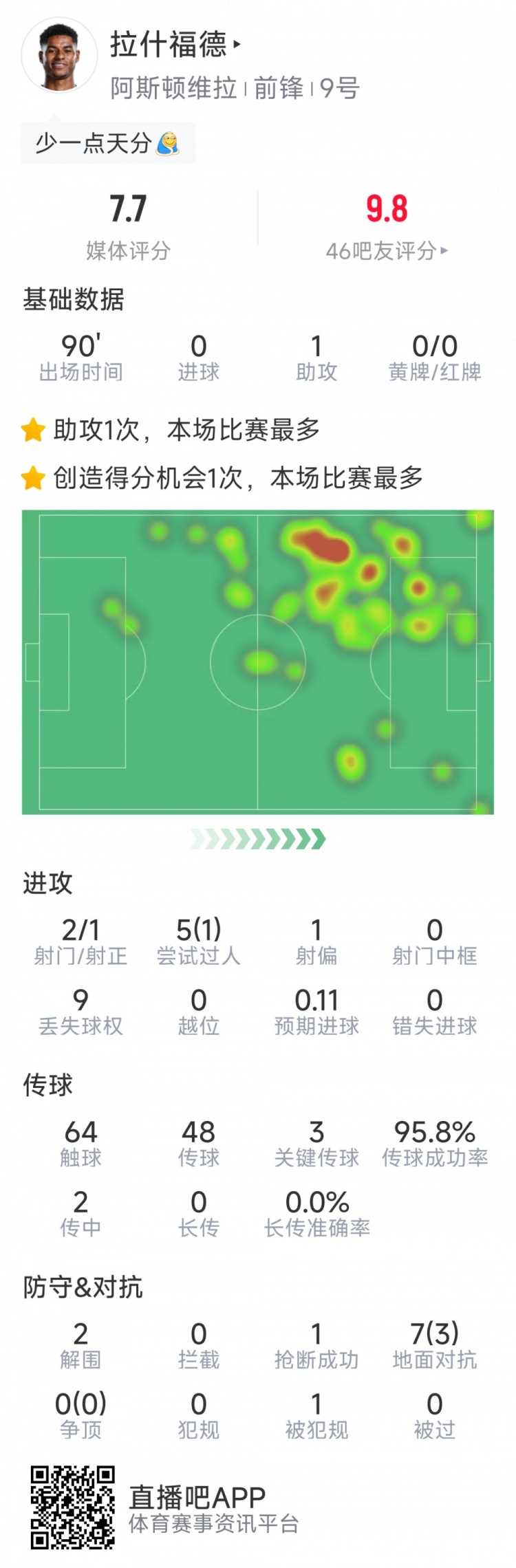 3月13日訊 在本輪歐冠,維拉3-0擊敗布魯日。本場(chǎng)比賽拉什福德送出助攻,以下為他在本場(chǎng)數(shù)據(jù):比賽時(shí)間90分鐘1次助攻2射1正5次過(guò)人1次成功64次觸球3次關(guān)鍵傳球傳球成功率95.8%2次解圍1次搶斷7次對(duì)抗3次成功評(píng)分7.7分 本文標(biāo)簽: 足球 英超 阿斯頓維拉