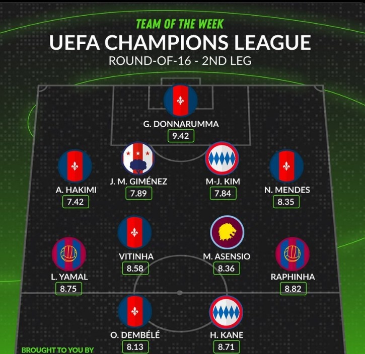 3月13日訊 歐冠16強(qiáng)戰(zhàn)次回合結(jié)束,數(shù)據(jù)網(wǎng)站W(wǎng)hoscored也盤點(diǎn)了本輪比賽最佳陣容,亞馬爾、凱恩、登貝萊等在列,具體如下:
