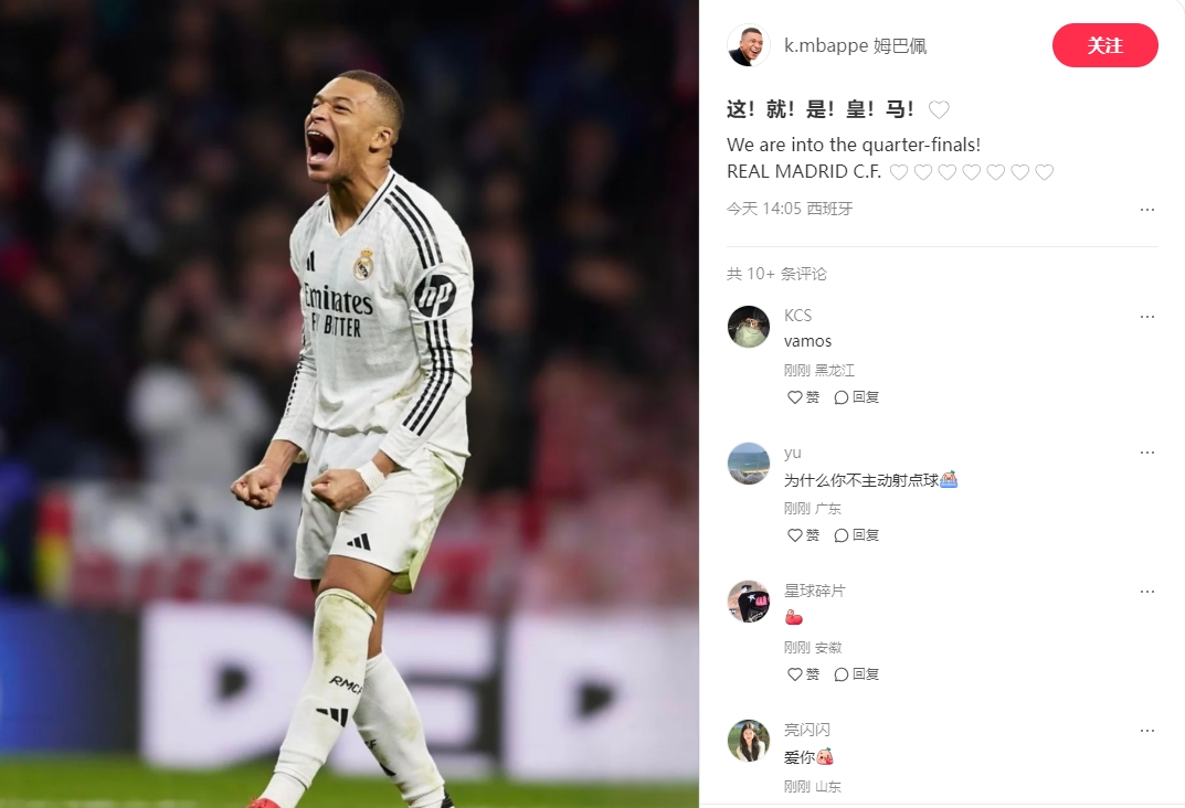 03月13日訊 皇馬兩回合2-2,點球大戰(zhàn)4-2擊敗馬競晉級歐冠8強。姆巴佩更新小紅書寫道:這!就!是!皇!馬!We are into the quarter-finals!REAL MADRID C.F.(我們進入了1/4決賽!皇家馬德里俱樂部) 本文標簽: 足球 西甲 皇家馬德里 姆巴佩