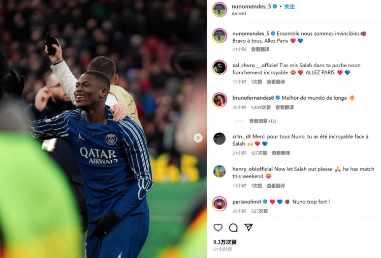 同薩拉赫對(duì)位的巴黎邊后衛(wèi)努諾-門德斯堪稱晉級(jí)的隱形功臣,他也在賽后通過社媒曬照慶祝:“團(tuán)結(jié)起來的我們是無敵的!大家做得很棒,巴黎加油!”