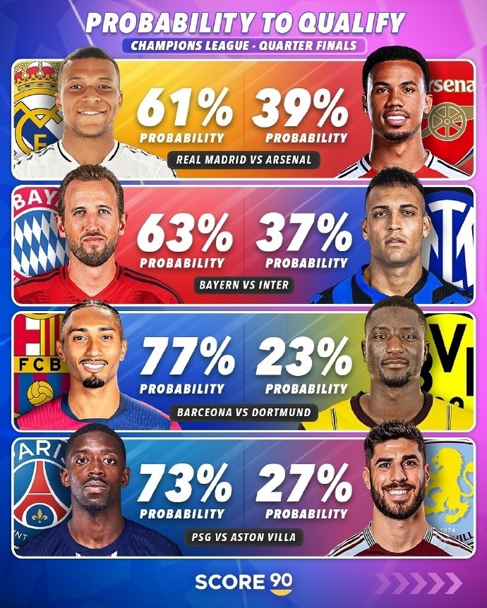 3月13日訊 歐冠1/4決賽賽程出爐后,外媒Score90也公布了各隊(duì)晉級(jí)概率和奪冠概率。
