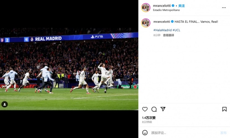 3月13日訊 皇馬點(diǎn)球大戰(zhàn)淘汰馬競(jìng),晉級(jí)歐冠8強(qiáng)!今日,安切洛蒂在社媒曬出賽后球員們狂奔慶祝的照片,寫(xiě)道:直到最后……加油,皇馬! 本文標(biāo)簽: 足球 西甲 皇家馬德里 安切洛蒂