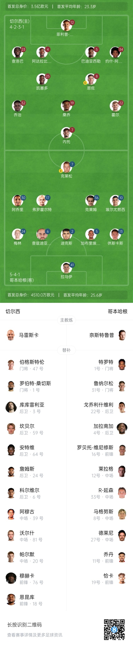 切爾西替補(bǔ):1-羅伯特-桑切斯、47-伯格斯特倫、6-科爾維爾、59-坎貝爾、3-庫庫雷利亞、64-安特維、24-里斯-詹姆斯、39-阿穆古、81-沃爾什、20-帕爾默、76-穆赫卡、18-恩昆庫