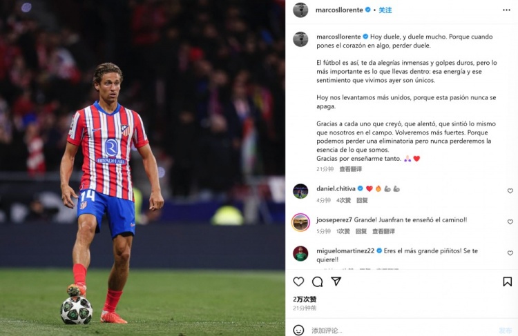 3月14日訊 馬競在本輪歐冠主場被皇馬點(diǎn)球淘汰,出自皇馬青訓(xùn)的馬科斯-略倫特罰丟點(diǎn)球,他也在今日通過社媒發(fā)文。