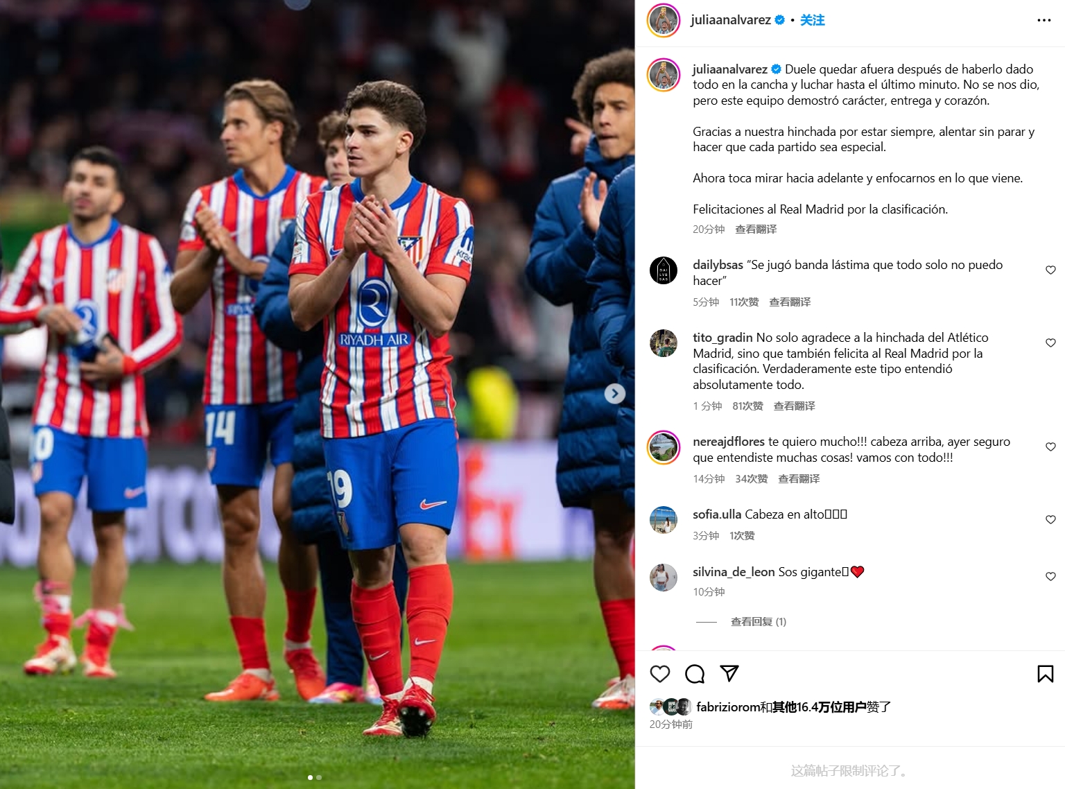 03月14日訊 歐冠16強(qiáng)對決,馬競在點(diǎn)球戰(zhàn)不敵皇馬,阿爾瓦雷斯點(diǎn)球戰(zhàn)點(diǎn)球罰進(jìn)但因二次觸球被判無效。阿爾瓦雷斯如今在社媒發(fā)文談到感想。