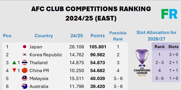 馬來(lái)超 40.039分 2026-27賽季亞冠精英聯(lián)賽名額1個(gè)
