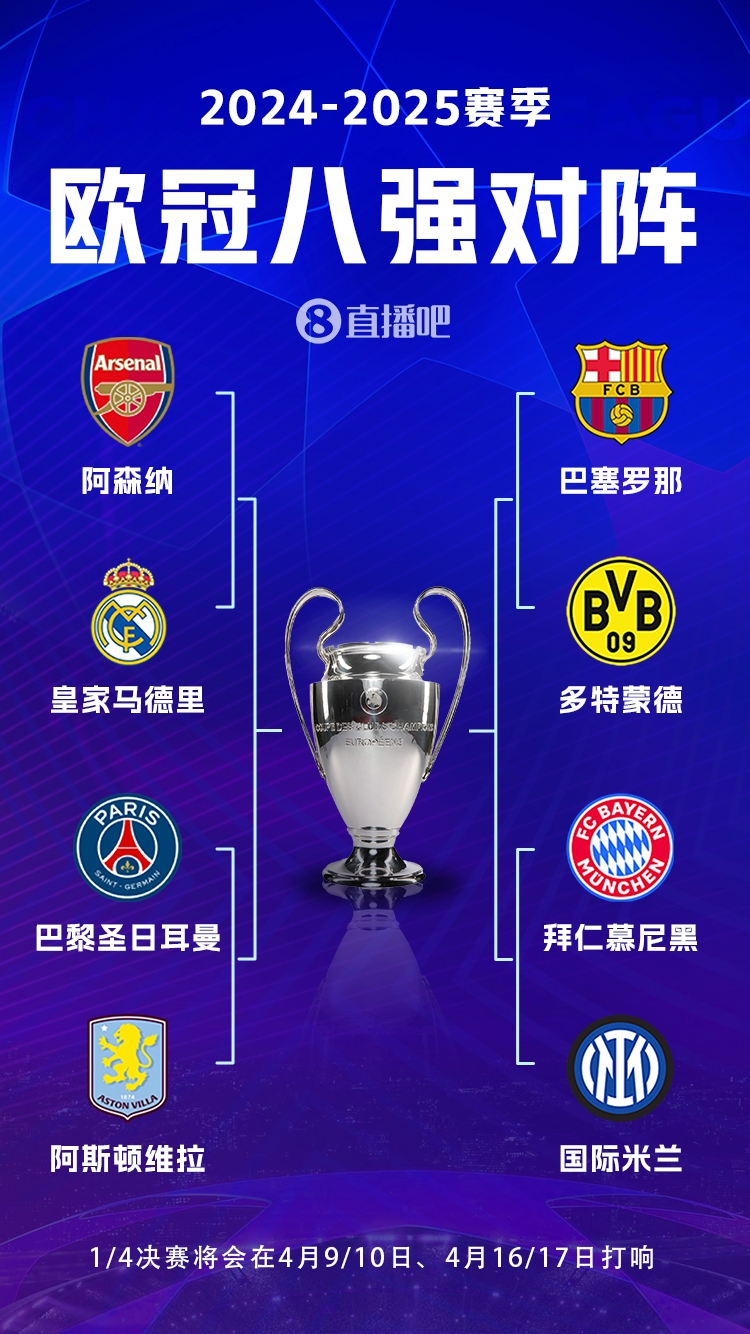 歐冠8強:拜仁、國米、巴薩、多特、巴黎、維拉、阿森納、皇馬