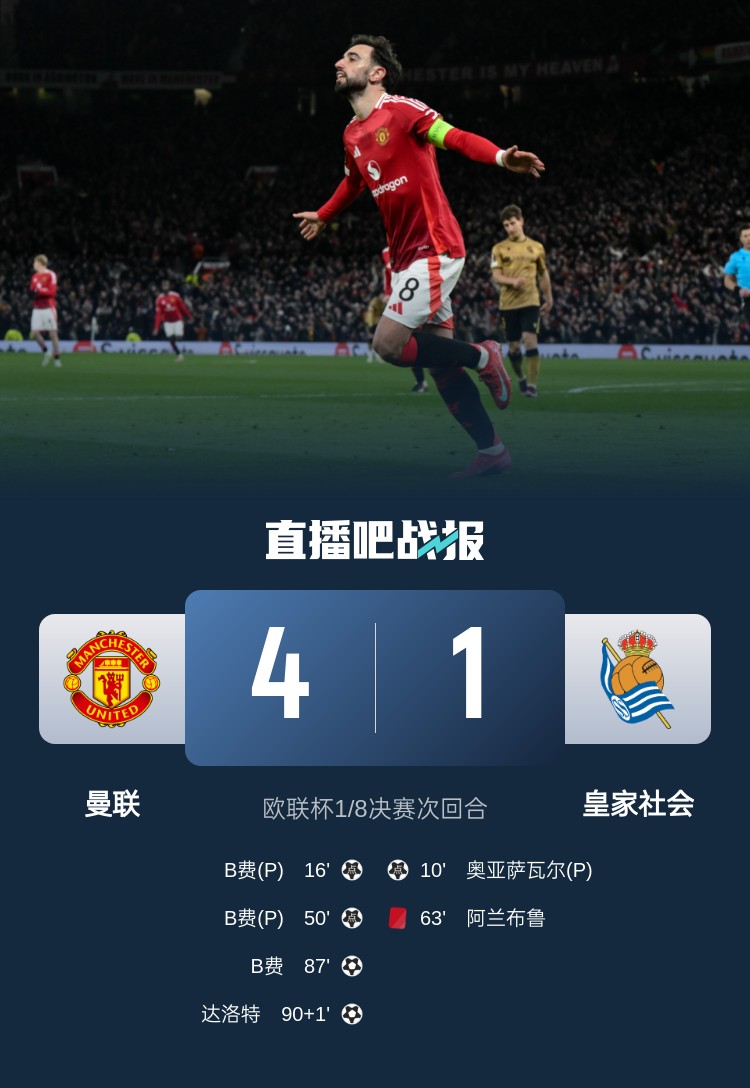 曼聯(lián)歐聯(lián)杯16強次回合4-1擊敗皇社,總比分曼聯(lián)5-2晉級!B費完成帽子戲法。