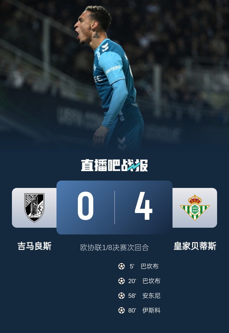 貝蒂斯4-0總比分6-2擊敗吉馬良斯,安東尼傳射+策動兩球!貝蒂斯晉級歐協(xié)聯(lián)8強!