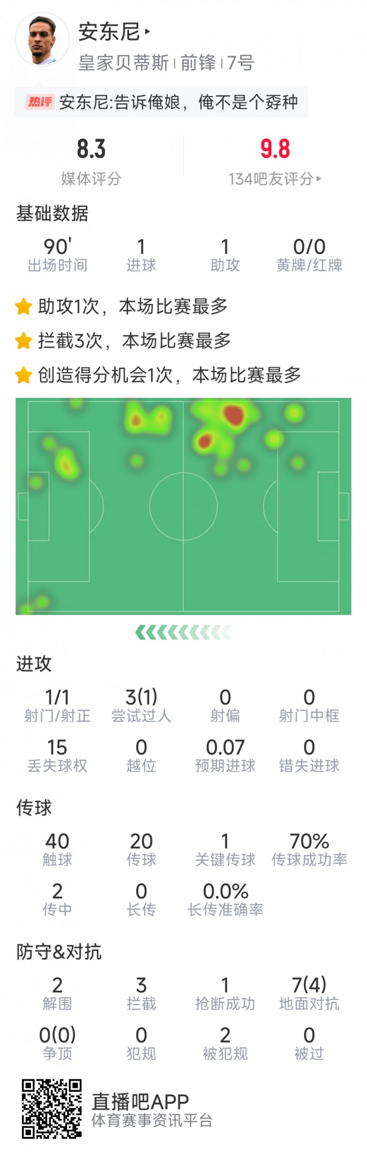 3月14日訊 在本輪歐協(xié)聯(lián)比賽中,安東尼傳射建功,以下為他在本場數(shù)據(jù):比賽時間90分鐘1粒進球1次助攻1次射門3次過人1次成功40次觸球1次關(guān)鍵傳球傳球成功率70%2次解圍3次攔截1次搶斷7次對抗4次成功評分8.3分 本文標簽: 足球 西甲 皇家貝蒂斯