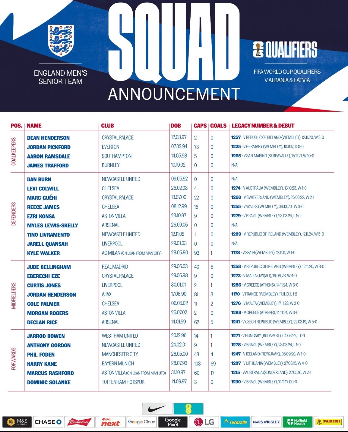 03月14日訊 英格蘭隊公布了新一期名單,這是新帥圖赫爾執(zhí)教下的首期大名單。