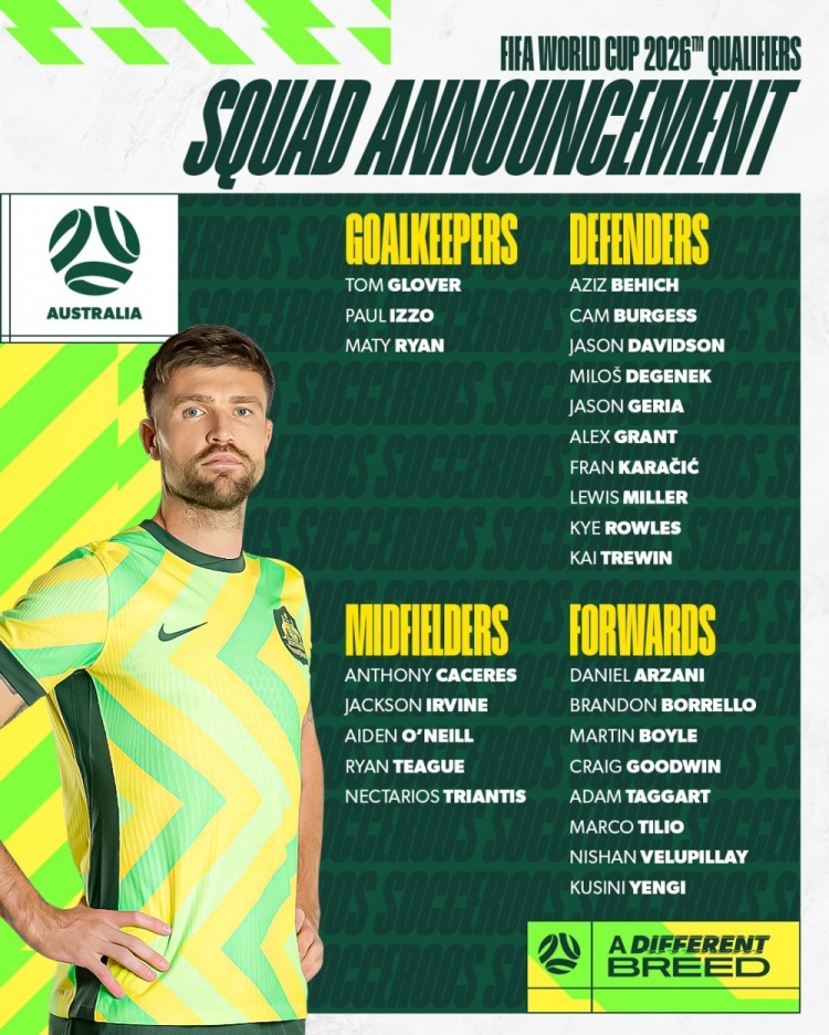 【相關(guān)】澳大利亞隊(duì)世預(yù)賽名單:“人民球王”古德溫領(lǐng)銜,3月25號(hào)對(duì)國(guó)足