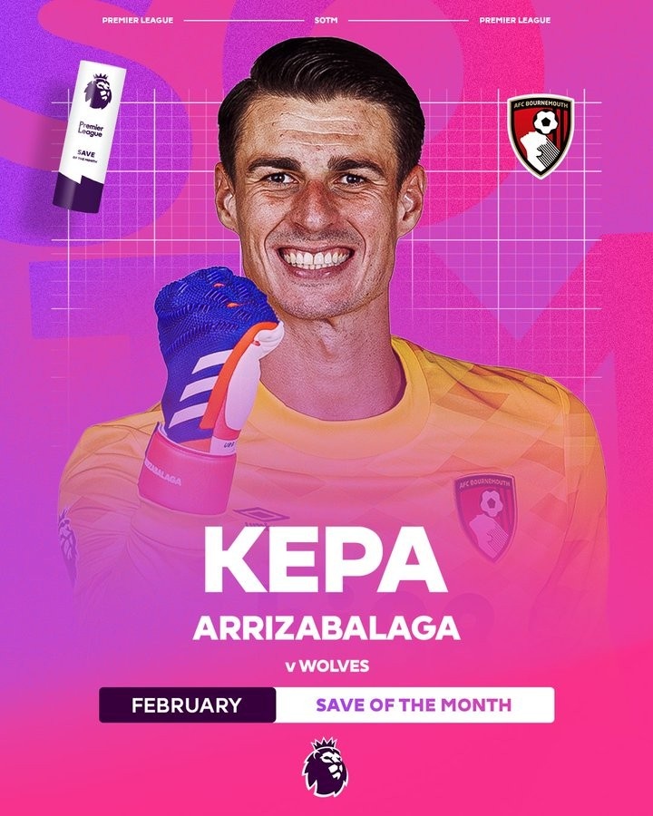 3月14日訊 英超官方宣布,切爾西外租到伯恩茅斯的門將凱帕,在對陣?yán)顷?duì)時(shí)的兩連撲當(dāng)選為英超2月最佳撲救。