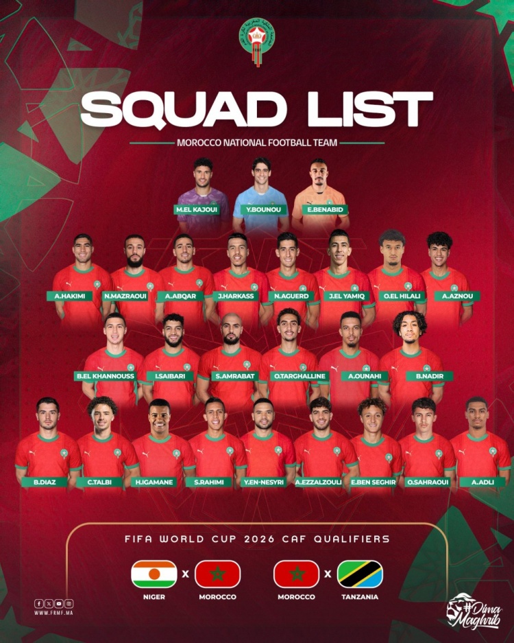 3月14日訊 摩洛哥公布最新一期國家隊名單,阿什拉夫、馬茲拉維、布拉欣-迪亞斯、恩-內(nèi)斯里、阿姆拉巴特等球員入選。