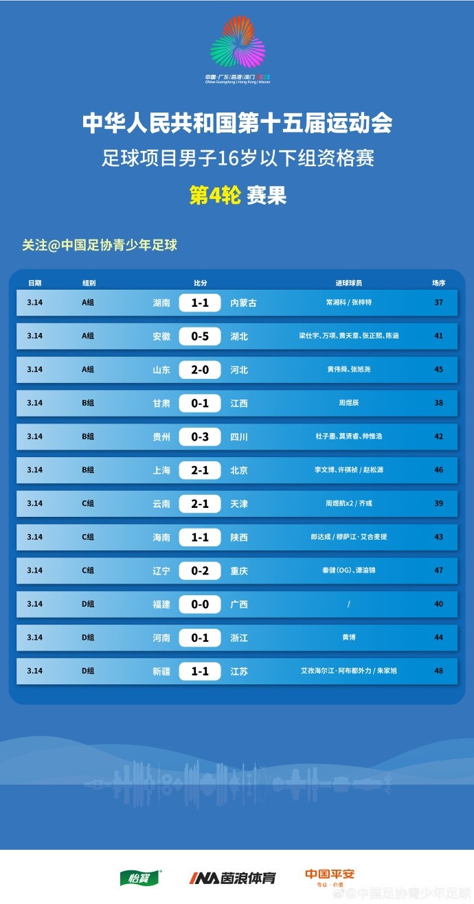 中華人民共和國(guó)第十五屆運(yùn)動(dòng)會(huì)足球項(xiàng)目男子16歲以下組資格賽第4輪賽果 ?????? 本文標(biāo)簽: 足球 中超 中國(guó)足球 轉(zhuǎn)載