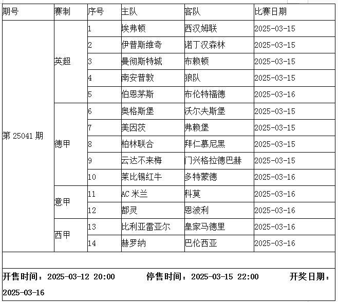 本周末的 傳足勝負(fù)彩第25041期中不乏焦點:英超,曼城主場對陣布賴頓;德甲,拜仁慕尼黑客場出征柏林;意甲,AC米蘭主場迎戰(zhàn)科莫;西甲,皇馬做客對壘比利亞雷亞爾。