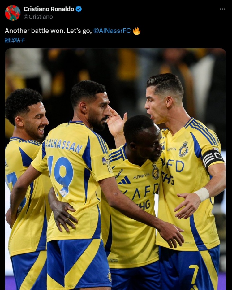 數(shù)據(jù)統(tǒng)計(jì)顯示這也是C羅生涯第928球,他也在賽后通過社媒曬出和隊(duì)友的慶祝照并配文:“又贏下一場戰(zhàn)斗,讓我們繼續(xù)前進(jìn)!@利雅得勝利俱樂部”。