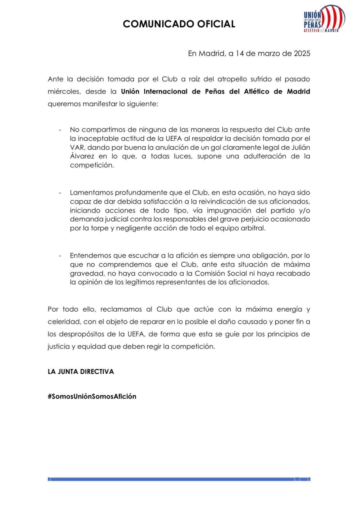 馬競球迷協(xié)會發(fā)表聲明,希望俱樂部對阿爾瓦雷斯點球被取消一事采取措施。