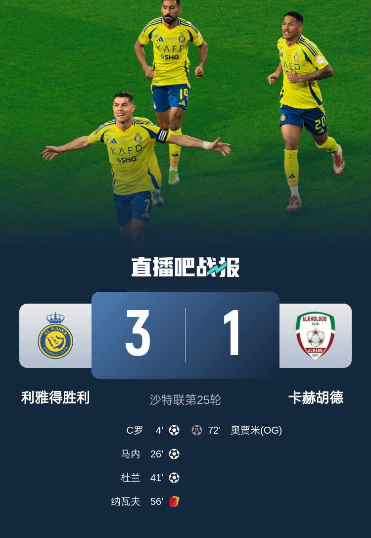 C羅破門+直塞策動,馬內和杜蘭建功,十人利雅得勝利主場3-1戰(zhàn)勝卡赫胡德。