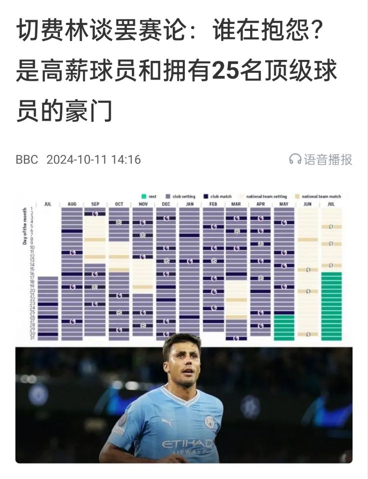 但對于這種抱怨,也存在相反的看法。比如歐足聯(lián)主席切費林曾在采訪回應,抱怨賽程最多的就是那些大俱樂部和高薪球員。但他們?nèi)找媾蛎浀母咝角∏【托枰銟凡慷嗵弑荣悂碇?。如果他們不愿減薪,那賽程縮減也很難辦。