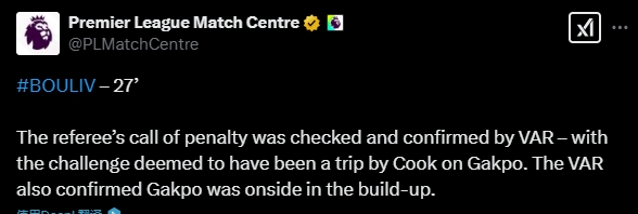 02月01日訊 英超第24輪,利物浦客戰(zhàn)伯恩茅斯,比賽第28分鐘,加克波禁區(qū)內(nèi)被庫克踢倒,裁判判罰點球。英超官方解釋這一判罰:裁判判罰的點球經(jīng)過VAR核實和確認(rèn),庫克的搶斷絆倒了加克波,VAR同時確認(rèn)加克波在進攻中不在越位位置。 本文標(biāo)簽: 足球 英超 利物浦 伯恩茅斯