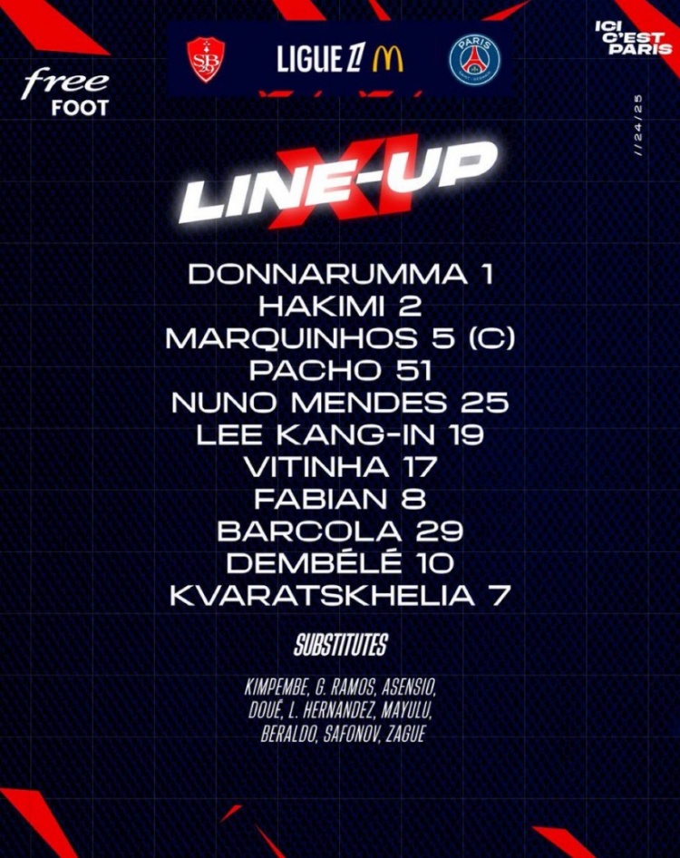 巴黎首發(fā):1-多納魯馬、2-阿什拉夫、5-馬爾基尼奧斯、51-帕喬、25-努諾-門(mén)德斯、19-李剛?cè)省?7-維蒂尼亞、8-法比安-魯伊斯、29-巴爾科拉、10-登貝萊、7-克瓦拉茨赫利亞