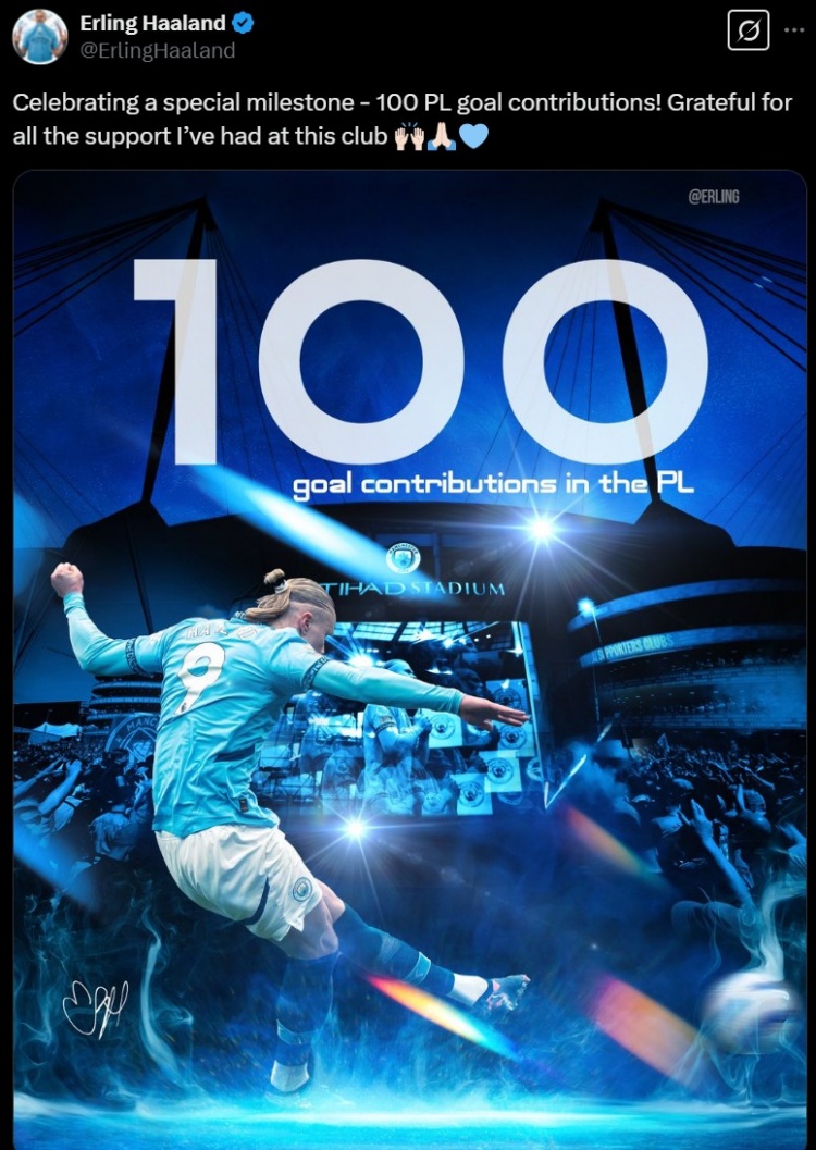 3月16日訊 在本輪英超曼城2-2戰(zhàn)平布萊頓的比賽中,哈蘭德打進一粒點球。這是哈蘭德生涯在英超直接參與的第100粒進球(84球16助攻),他在個人社媒也曬出紀念海報,配文寫道:“紀念達成了一項特殊的里程碑—第100次參與英超進球。感謝我來到球隊以來一直支持我的人們?!?/p> 本文標簽: 足球 英超 曼城