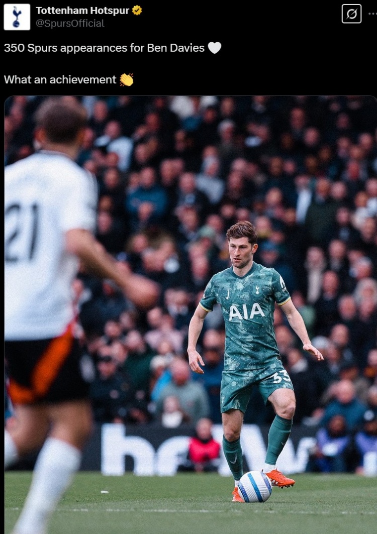 3月16日訊 在本輪英超熱刺對(duì)陣富勒姆的比賽中,本-戴維斯為熱刺首發(fā)登場。本場比賽也是本-戴維斯生涯代表熱刺各項(xiàng)賽事第350次登場,球隊(duì)官推也曬照為其紀(jì)念,配文寫道:“多么了不起的成就!”本-戴維斯自14/15賽季開始效力熱刺,這名31歲后衛(wèi)在此前的比賽為球隊(duì)貢獻(xiàn)9球23助攻。 本文標(biāo)簽: 足球 英超 熱刺