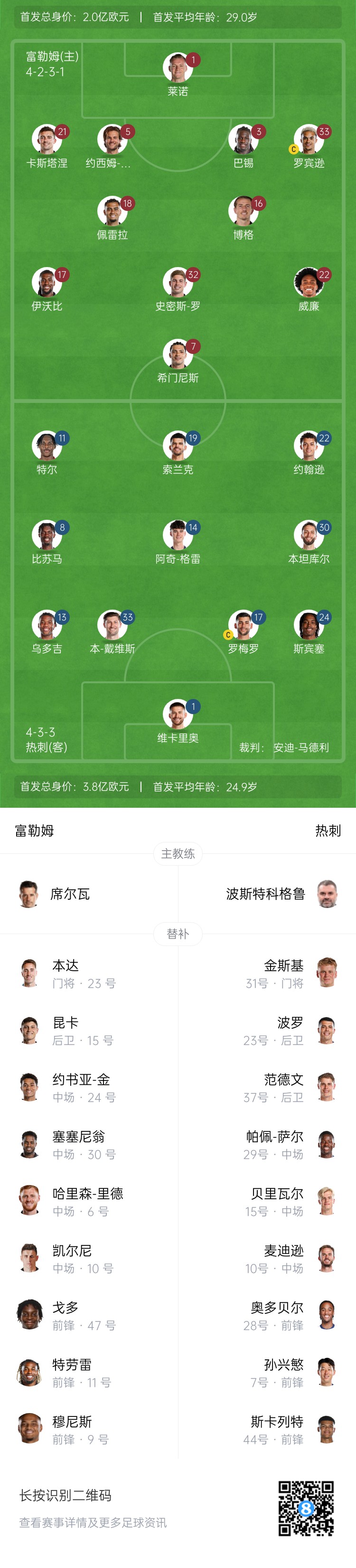 富勒姆首發(fā):1-萊諾、3-巴錫、5-安德森、21-卡斯塔涅、33-安東尼-羅賓遜、16-桑德-博格、18-佩雷拉、32-史密斯-羅、17-伊沃比、22-威廉、7-勞爾-希門尼斯