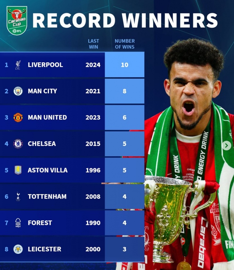 3月16日訊 利物浦即將迎來同紐卡的聯(lián)賽杯決賽,官方數(shù)據(jù)統(tǒng)計顯示總計有23支不同的俱樂部在迄今為止舉行的61屆聯(lián)賽杯決賽中奪得冠軍,紅軍是該項賽事奪冠次數(shù)最多的球隊。