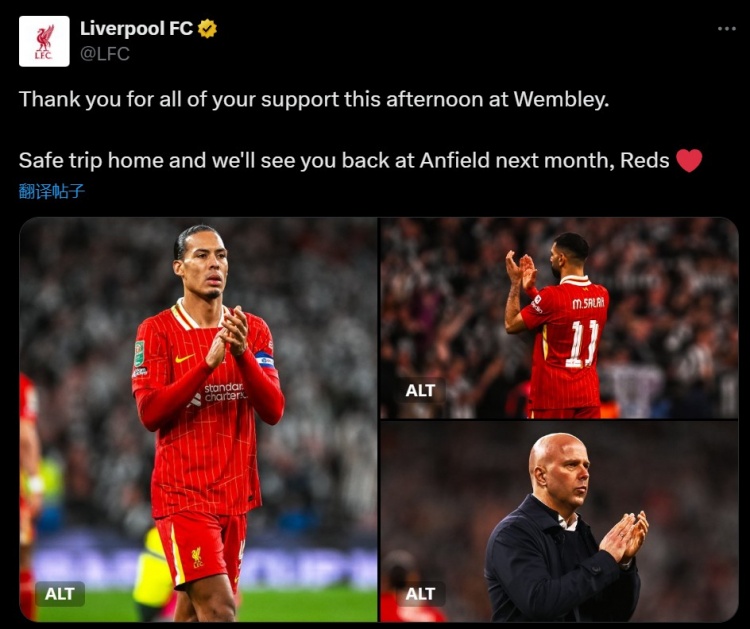 利物浦官推也在賽后感謝了球迷:“感謝你們今天下午在溫布利的支持。安全回家。紅軍們,我們下個(gè)月安菲爾德再見?!?/p>