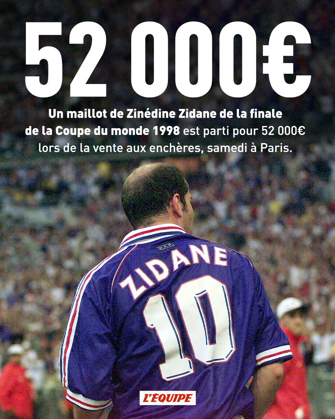 巴黎拍賣行舉辦了一場(chǎng)體育收藏品拍賣會(huì),當(dāng)日拍賣會(huì)的最大亮點(diǎn)是一件為1998年世界杯決賽齊達(dá)內(nèi)的備用球衣,印號(hào)為10號(hào),最終以5.2萬歐元的價(jià)格成交。