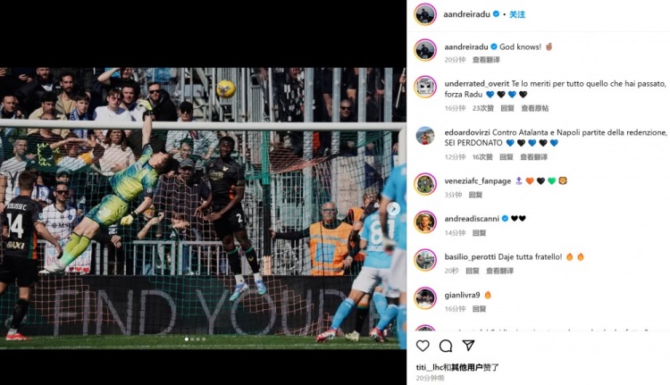 他也在賽后通過(guò)社媒曬出比賽照慶祝并配文:“只有上帝明白!”。拉杜在此前效力國(guó)米時(shí),曾因?yàn)闋?zhēng)冠關(guān)鍵戰(zhàn)失誤導(dǎo)致球隊(duì)最終未能奪得冠軍。