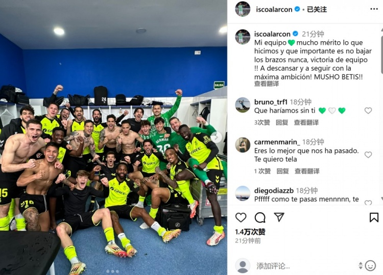 3月17日訊 在本輪西甲,貝蒂斯在兩球落后的情況下最終3-2逆轉(zhuǎn)戰(zhàn)勝萊加內(nèi)斯。本場比賽伊斯科點射破門拉響反擊號角,賽后伊斯科也在社媒曬出更衣室內(nèi)全隊球員慶祝合影,配文寫道:“我的球隊????我們做到的事情值得被認可,永不放棄太重要了。這是一場團隊的勝利,現(xiàn)在是時候休息調(diào)整,以最高昂的斗志繼續(xù)前進。貝蒂斯加油!” 本文標簽: 足球 西甲 皇家貝蒂斯