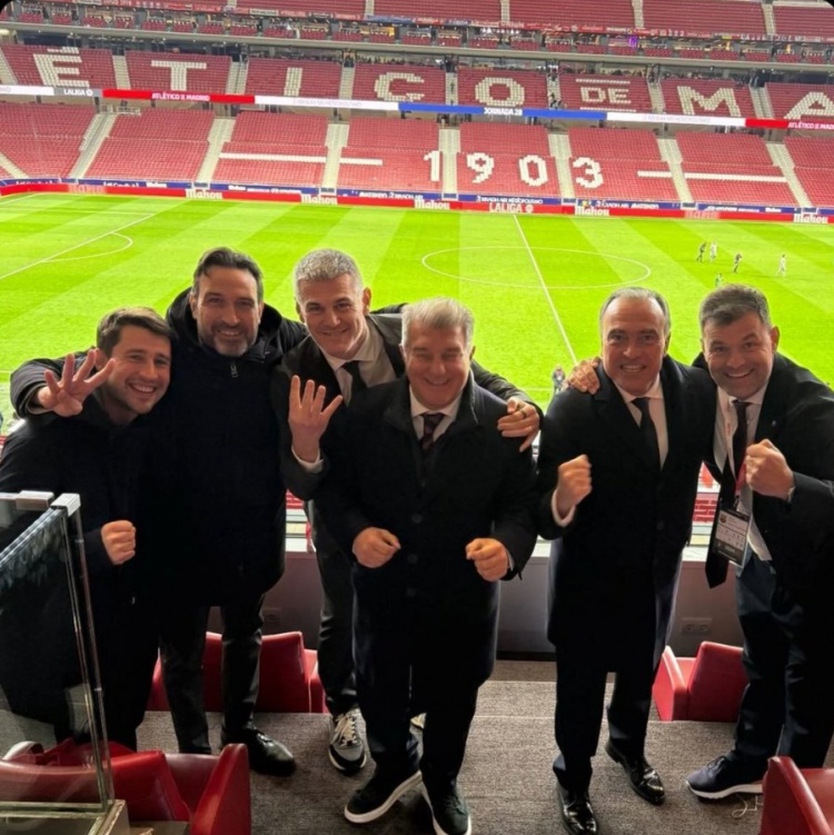 包括主席拉波爾塔在內(nèi)的一眾高層賽后在現(xiàn)場(chǎng)合影留念慶祝,多人手中還比出了“4”的手勢(shì)。