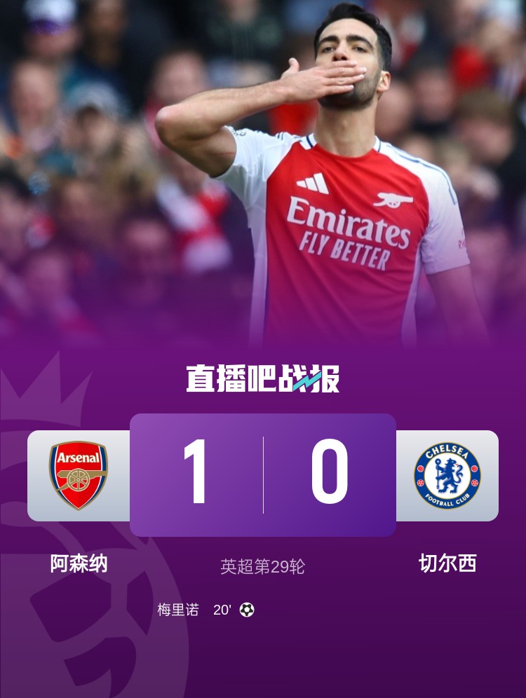 梅里諾頭球破門,阿森納1-0切爾西,距榜首12分。
