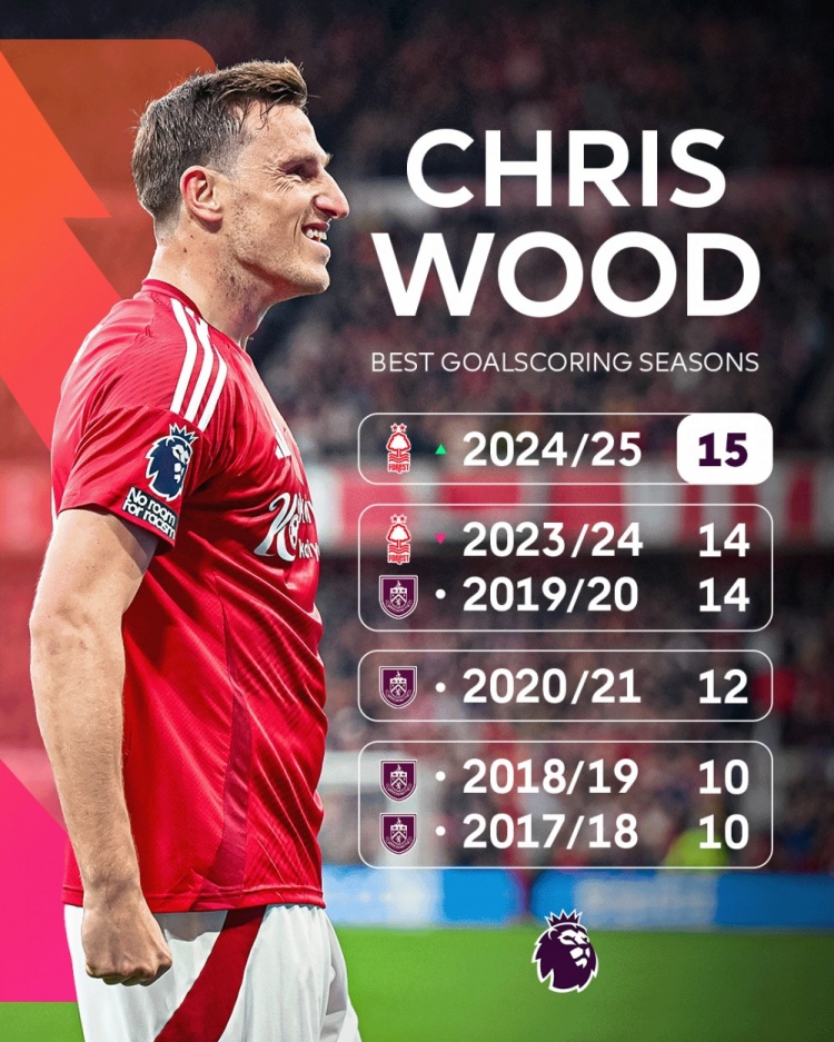 據(jù)英超官方數(shù)據(jù)統(tǒng)計(jì),本賽季到目前為止,伍德已經(jīng)在英超聯(lián)賽中打進(jìn)15粒進(jìn)球,這是他進(jìn)球最多的一個賽季,此前,他曾在2019-20賽季以及2023-24賽季打進(jìn)14球。